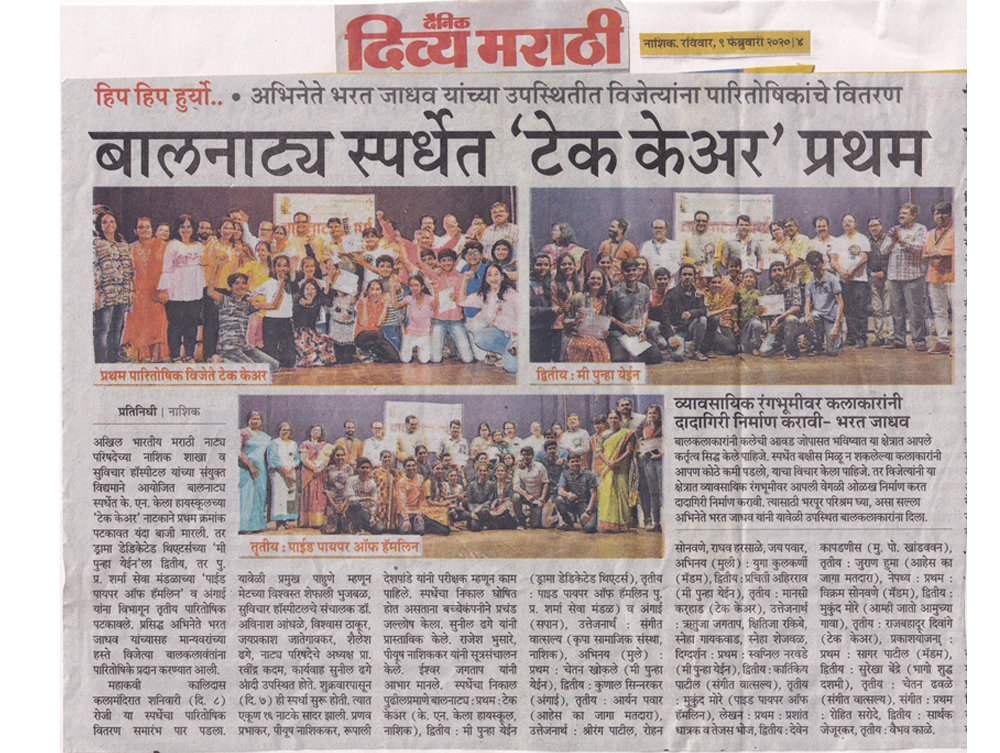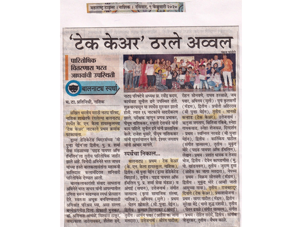 - The Marathi drama ‘Relay,’ has made the Kelaites feel proud. It bagged many prizes at different levels, at the state level ‘Relay’ bagged the second prize, a cash prize of Rs.60, 000. Individual prizes were bagged by Mr Dhananjay Wable for direction, Mr Raju Hitange for stage decoration, Mst. Sharvayu Dhemse as the Best Actor. The prizes were given in Kolhapur, Prize Distribution Ceremony held in on 21st July 2019.
